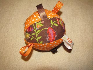 So I found this tutorial on a blog i love to follow called homemade by jill. I am not a big fan of pastels so i found some bright colored fabrics and here is how they turned out! One has a jingle bell on the inside and the other has pieces of a potato chip bag inside (to make it crinkle). I just need to sew up the opening and Khloe will have a couple of new toys.